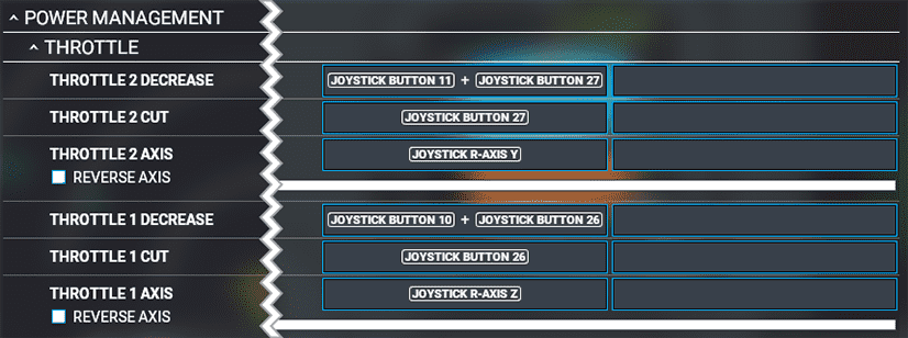 The THROTTLE 1/2 DECREASE mapping to Buttons 10, 26 and Buttons 11, 27 simulates the reverser when the Bravo's reverser lever is lifted (buttons 10 and 11) and the thrust lever is pulled back (buttons 26 and 27). This activates the buttons configured in the image above, and in turn decreases throttle power to negative values for the reverser.