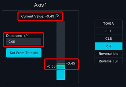 Set Reverser on Axis to OFF if your throttle does not have a range for the reverser thrust (lowest setting is idle).