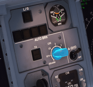To finalize the setup, the auto brake mode selector knob is turned to the "BTV" option, which arms BTV (this should be checked in the PFD FMA).